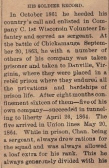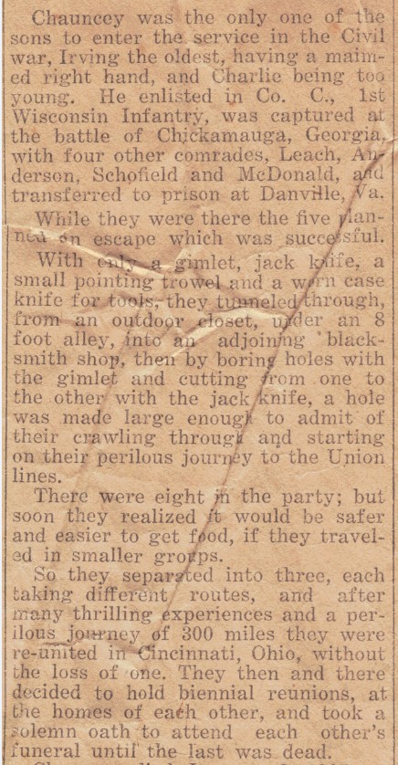 Chauncey was born January 25, 1842. He was the only one of three boys that was eligible to join the military for the Civil War in October, 1861. Achieving the rank of sergeant, he was captured September 19, 1863 at the battle of Chickamauga, Georgia. After escaping the prison camp, he mustered out Oct. 13, 1864. He fought in the same battle where Colonel Hans Heg was killed in action that same day.