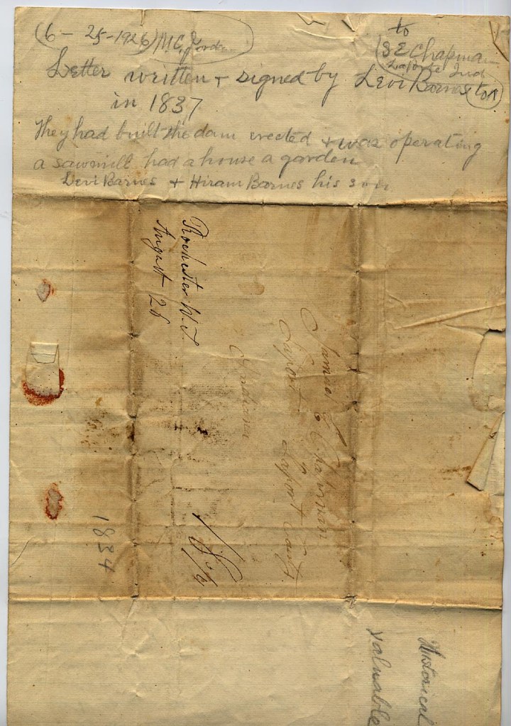 Several written sources state that in 1837, Chapman and a group of pioneers built the dam and erected a sawmill. According to the following original letter from Barnes to Chapman, dated August 26, 1837, Chapman was in LaPorte and Barnes was in Waterford. It was time to get the families and personal possessions while Barnes stayed in Waterford to protect their interests.
