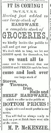 A newspaper article from 1878 sites; “Groat & McKenzie, in the large brick store on the west side of the river, carry on a general hardware business. Their store is well filled with everything in the hardware line, and arranged in the most tasty manner. Mr. McKenzie, a practical tinner, superintends the work in that department, while Mr. McKenzie is always ready to sell a stove or a pound of nails, to suit the purchaser.”6 It operated until 1896 when the business was sold George Foxwell.