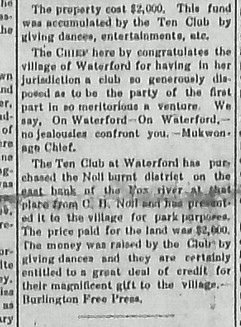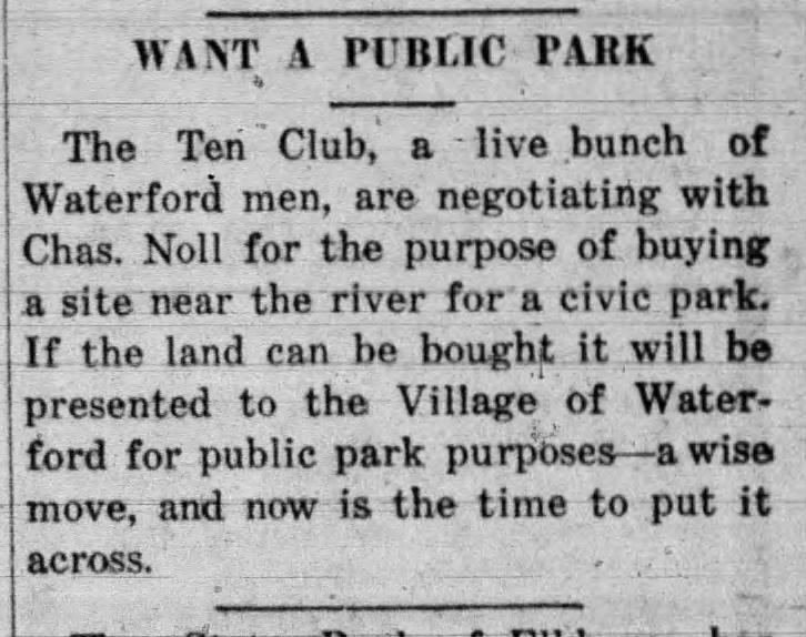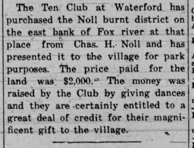 In May – 1919, the group negotiated to buy the land on the east bank of the Fox River from Chas. Noll for $2,000 to develop a village park.
