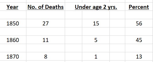 The publication, U.S. Federal Census Mortality Schedules Index, 1850-188011 has a listing of those who died in the year previous to the census along with their age and the cause of death. Only three years are listed for Waterford but it is interesting to note the percentage of deaths of those 2 and younger. Table by R.E. Gariepy, Sr.