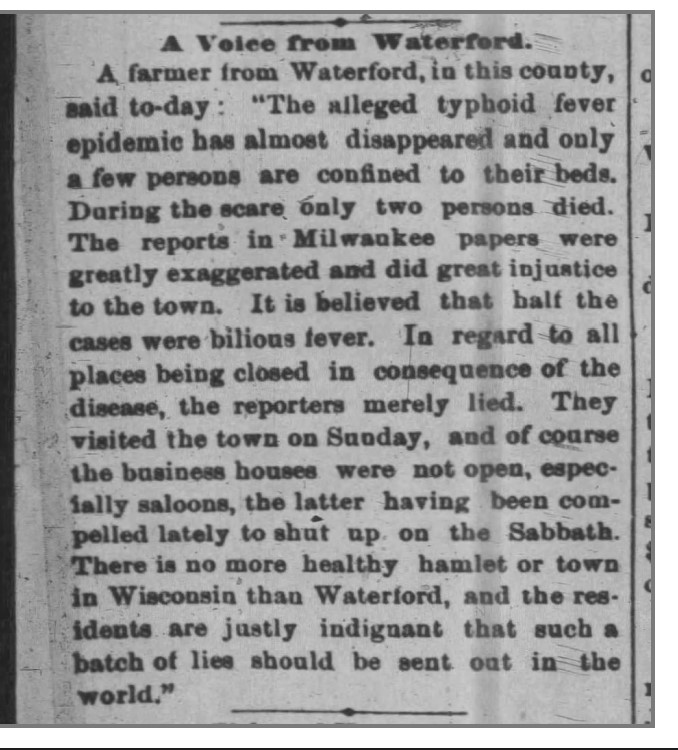 1886 – Typhoid – Waterford Post, July 24, 1886 and Green Bay Press Gazette, July 9, 1886.