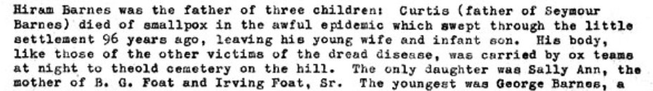The cemetery, is reported to have been started by Levi Barnes, one of the two Village founders . One of Barnes descendants reported that the first burial at the site took place in 1837 and was Hiram Page, Jr.? son of Hiram Page and Sally Jane Barnes Page, Grandson of Levi and Lucretia Barnes. The site is only a block west of the original Chapman-Barnes log cabin. There was no established cemetery in the area at the time. Also, it was common for the pioneers to bury loved ones on their own land. This cemetery was the primary burial ground for the area, so it is assumed that most were interred here during the early years of the Village, from 1837 to 1857. Just two miles southwest of this site is the Rochester Cemetery, established in 1842, which could have been an alternative burial site.