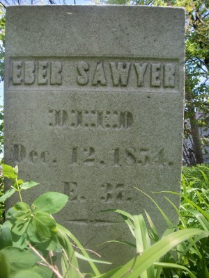 Eber Sawyer was born in New York. He was the son of Robert Sawyer, a Civil War veteran who owned a homestead adjacent to the cemetery. He married Abigail Austin (1825-1908). Per the 1850 census of the town of Norway, Wisconsin, they had three sons: John, age 6; Robert, age 4 and Eber, a baby.