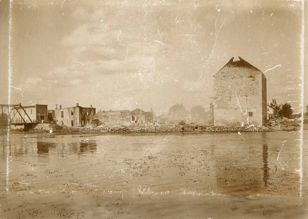 Note the Ice House on the right and the large Charles Noll building in the background on the left. The Noll building does not appear to be the original building and is perhaps an apartment building. The ice house appears to have been restored somewhat until the Ten Club Park was built. The area on the left became the Ten Club Park which has now extended past the St. Thomas Church.